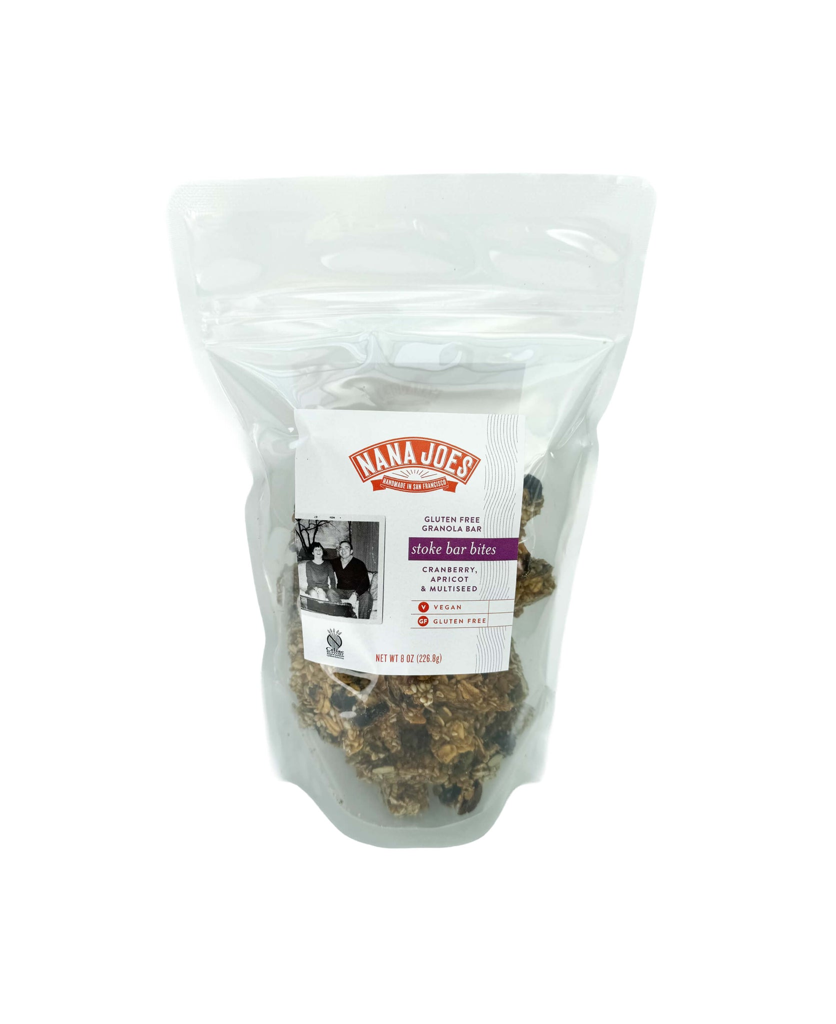 Enjoy a bag of EPIC-ly delicious Stoke Bar bites! Exactly like our Stoke Granola Bar, but in fun bite size pieces and a resealable bag for sharing on-the-go. As you know, all NJG granola bar batches are mixed and cut by hand. This leaves these tastey and crumbley end bits on the tray that we call Bar Bites. Nothing goes to waste at Nana Joes Granola, so we take and package up these Bar Bites for you! Now available online in shareable and resealable bags. Available only while supplies lasts.