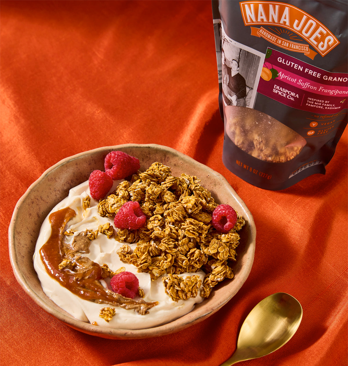 At the Mir family farm in Kashmir, rows of apricot and almond trees slice through saffron fields. We developed a tangy, jammy Apricot-Saffron Frangipane for their cookbook inspired by the farm, and inside this bag, you'll find those very flavors in granola form -- all of it, a perfect reminder that what grows together ultimately goes together.