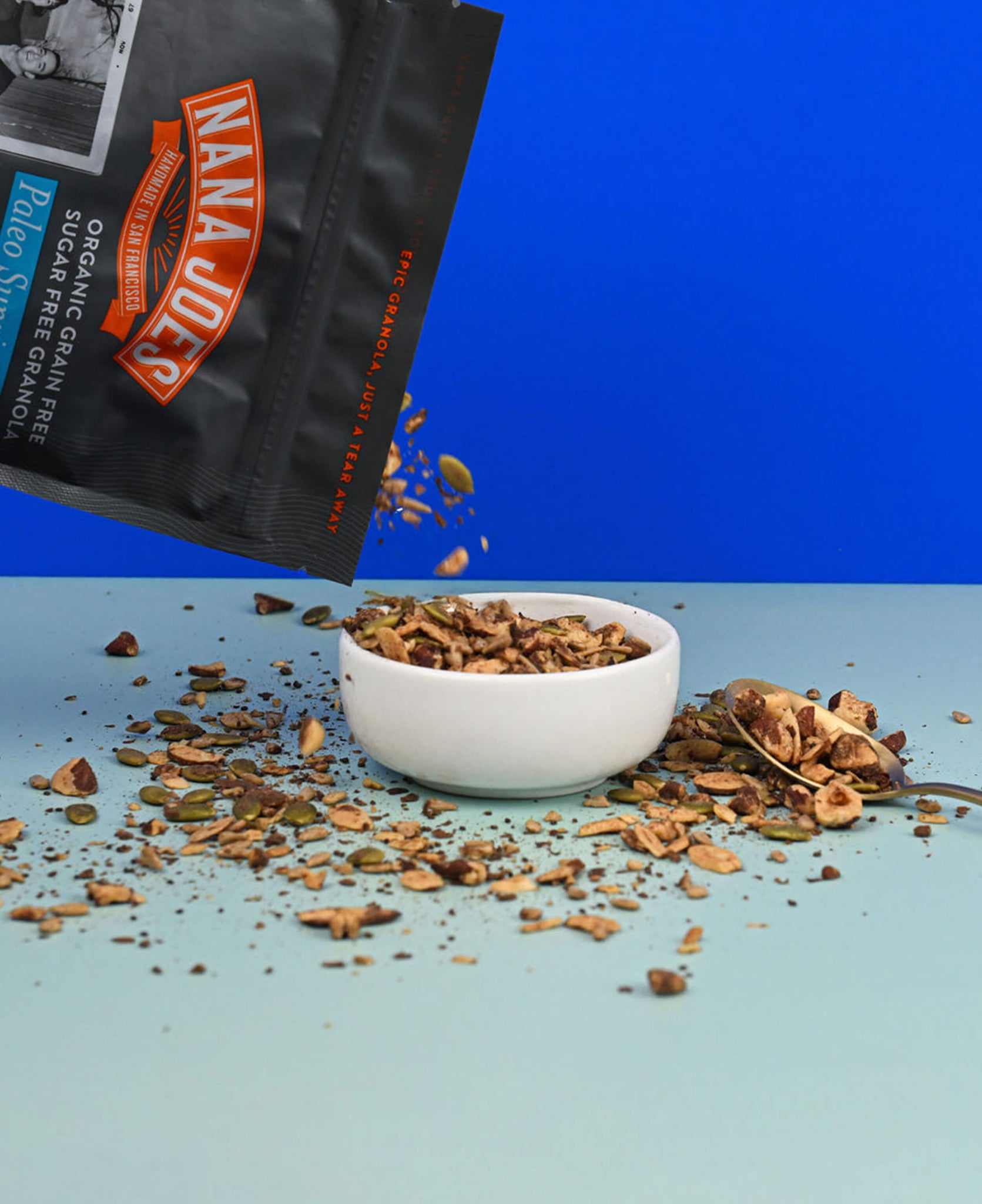 Nana Joes Granola Paleo Sunrise Hazelnut Keto Blend pouring into white bowl on two-tone blue background